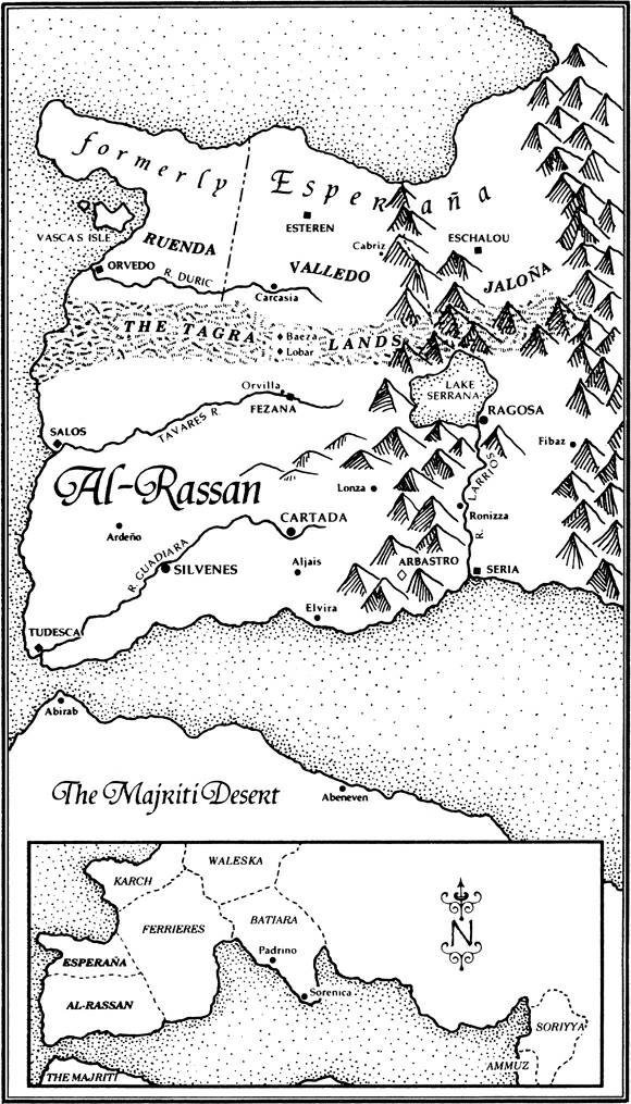 Pour vous expliquer un peu le délire de ce bouquin, il vaut mieux que vous jetiez d'abord un œil à la carte ci-contre. Voilà, Guy Gavriel Kay utilise toujours son modèle de fantasy historique qui change les noms de tout le monde mais respecte une période donnée de notre histoire, et là c'est l'Espagne de la Reconquista (où la plus grande partie de la péninsule était occupée par les musulmans) qui lui sert de canevas pour son roman. Remplacez Espéragne par Espagne, Jaddites par Chrétiens, Asharites par Musulmans et Kindaths par Juifs et vous verrez mieux le tableau. Mais l'écrivain se sert toujours de l'histoire pour nous raconter les mésaventures de personnages qui se débattent dans cette grande marmite. Rodrigo, Ammar et Jehane vont être baladés dans un pays déchiré par les haines et les incompréhensions. Un des grands talents de Kay est toujours de nous immerger dans la psychologie et les usages d'une époque lointaine, il prend son temps pour nous glisser dans leur état esprit, nous faire accrocher à leurs valeurs et leurs conflits.