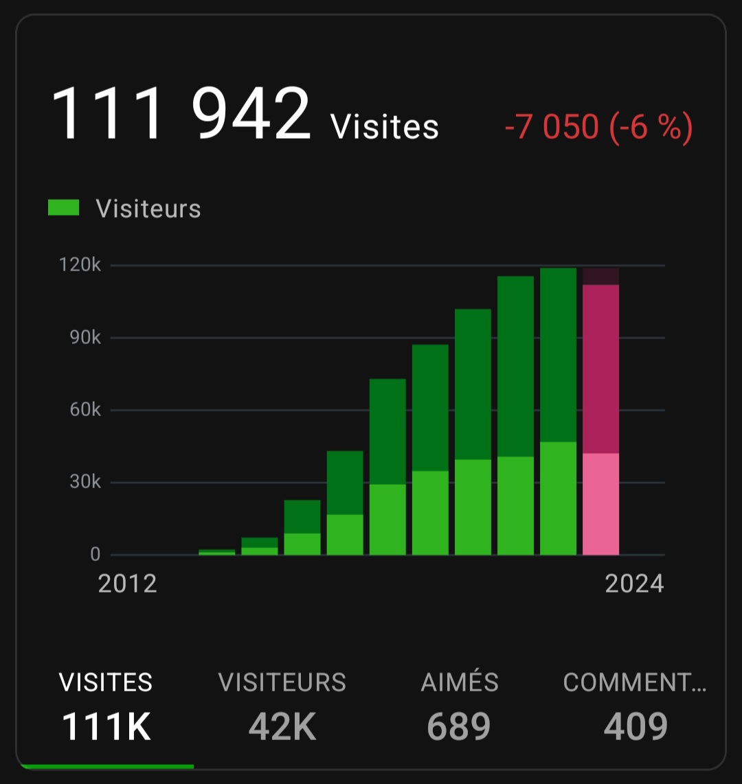 Côté stats on arrive à une très légère baisse par rapport à l'an dernier mais un nombre tout de même impressionnant de 111 942 pages vues pour un peu plus de 42 000 visiteurs uniques. La petite baisse s'explique par un nombre de chroniques moins important mais également l'arrêt des posts sur Twitter et Instagram qui, fatalement, fait baisser les clics immédiats. Retrouvez-moi sur Mastodon et Bluesky, d'ailleurs !