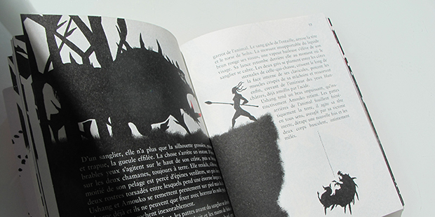 C'est surtout ce va-et-vient entre le texte et l'illustration qui rend l'objet unique, les deux cohabitent, se poussent, se tirent, se tordent, on se promène dans l'histoire et dans les pages, on penche le livre et on louche sur les dessins. Melchior Ascaride illustre ce voyage dans un style fait de silhouettes et de formes en noir, blanc et rouge. Les formes brutes et anguleuses évoquent souvent la pierre, l'os, pour partir ensuite vers des représentations plus symboliques. On a une direction artistique très franche qui rend vraiment bien, c'est assez époustouflant. Elle colle parfaitement à l'ambiance mystique, mythique et spirituelle qui englobe l’œuvre.